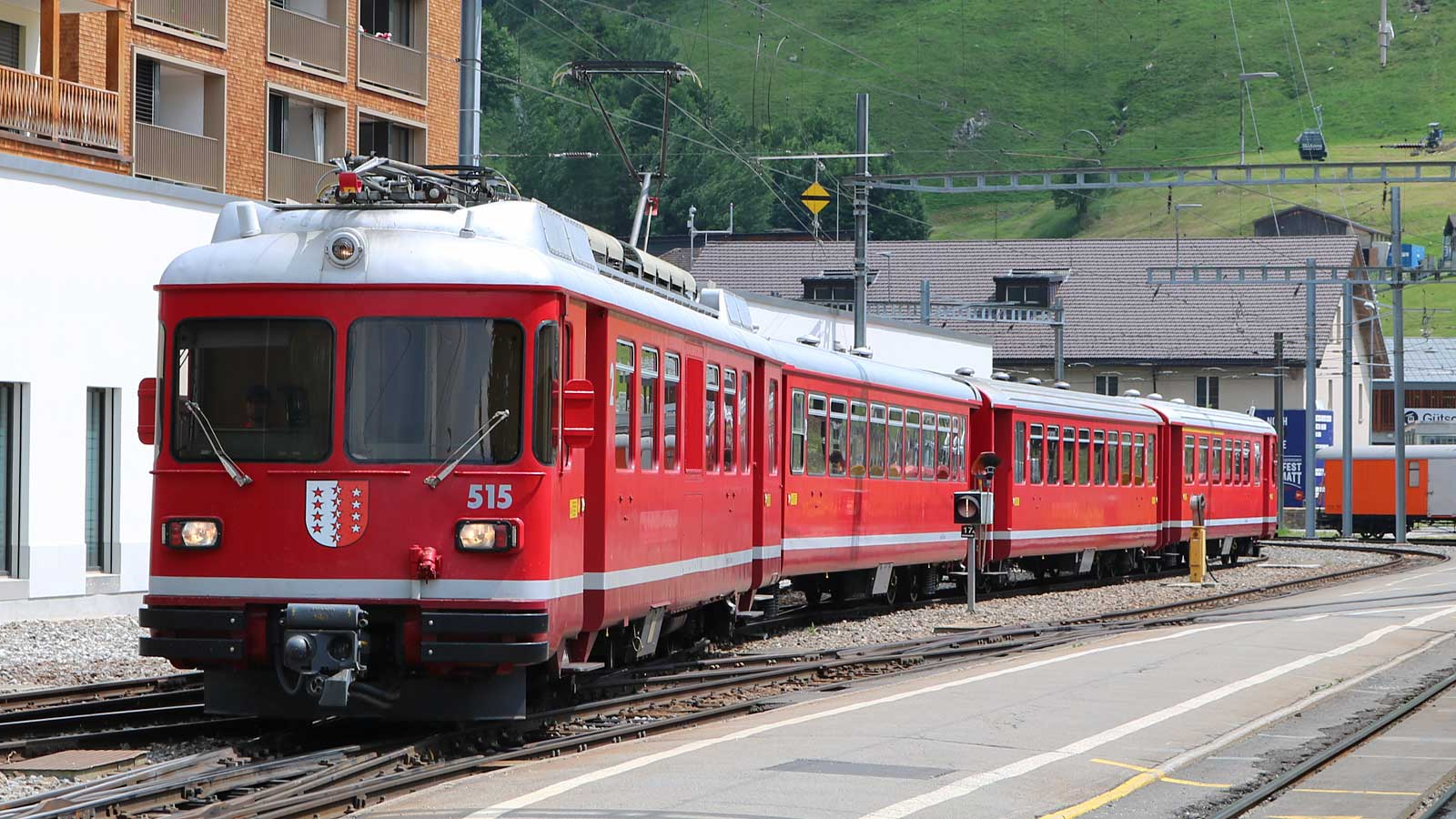 Neuheit BEMO H0m 7243 255 / 7343 255 - MGB Be 4/4 515 / B 2414 / B 2413 / ABDt 1716 Pendelzug "Bundes Pfadilager", rot / dunkelrot